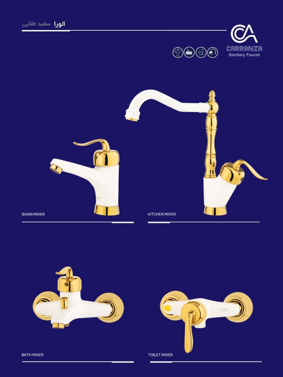 شیر 4 تیکه کارنزا مدل آلورا با کیفیت و طول عمر بسیار بالا طراحی این ست جزوه پر فروش ترین مدل های امسال بوده است و رنگ سفید طلایی آن باعث زیبایی چشم نواز شده است برای تولید شیرالات کارنزا از برنج با کیفیت و ضد زنگ استفاده میشود تا شما مشتریان عزیز از کیفیت این برند مطمین باشید.